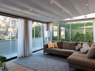 Le vetrate scorrevoli possono essere combinate in molteplici varianti, grazie ai binari paralleli. La possibilità di apertura arriva all'80%. I vetri sganciabili assicurano una facile pulizia e il ricircolo dell'aria.