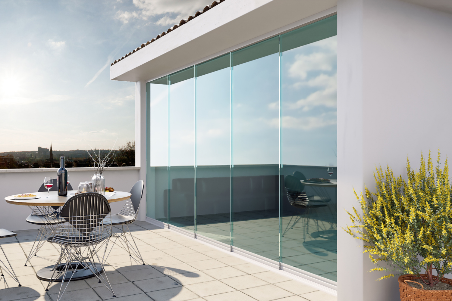Le vetrate scorrevoli possono essere combinate in molteplici varianti, grazie ai binari paralleli. La possibilità di apertura arriva all'80%. I vetri sganciabili assicurano una facile pulizia e il ricircolo dell'aria.